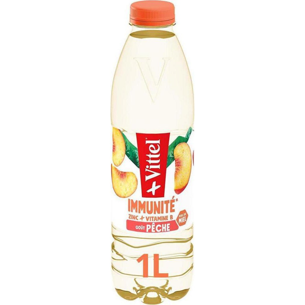Vittel saveur pêche 1L. Ingrédients détaillés sur l'emballage extérieur.