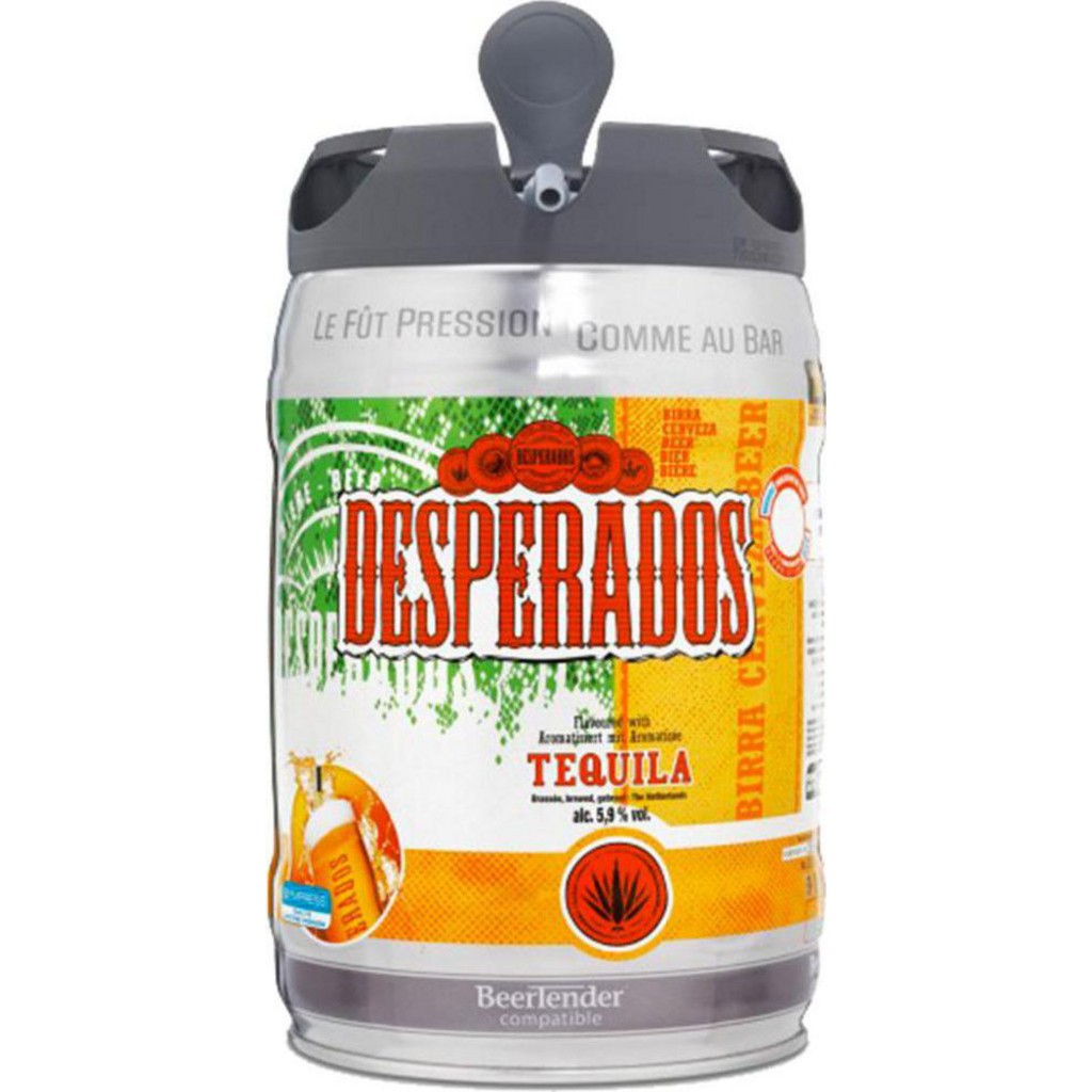 Desperados Original est une bière aromatisée tequila et présente une robe jaune brillante et limpide. De fermentation basse, brassée avec du malt d'orge. À déguster bien fraîche entre 4°C et 6°C, Desperados Original offre un goût puissant et prononcé en bouche, avec de subtiles notes citronnées et quelques touches épicées. Taux de 5,90%. Lot économique de 2 fûts. Eau, malt d'orge, maïs, sirop de glucose, sucre, extraits de houblon, arômes (dont 75% Tequila), acidifiant: acide citrique.